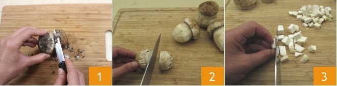 To prepare vine leaf baskets with porcini mushrooms and Grana Padano, first clean the mushrooms: gently scrape them with a smooth-edged knife to remove any soil residue 1, then separate the cap from the stem 2 and cut the latter into cubes 3.