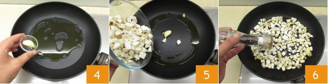 In a skillet, heat the oil with a clove of garlic 4, then add the mushroom stems 5, salt, and pepper 6.