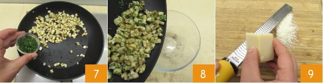 Cook over low heat for about 5 minutes, then turn off the heat, add the chopped parsley, mix well, pour into a bowl 8, and let cool. Meanwhile, grate the Grana Padano PDO 9.