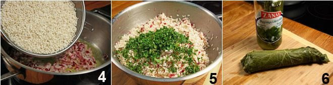 Sauté the finely chopped onion in a pan with extra virgin olive oil until it wilts. Then add the rice, chopped parsley, chopped mint, dill, salt, pepper, half a cup of water and let it cook for 10 minutes, stirring occasionally to prevent the rice from sticking 5. Then prepare the vine leaves 6,