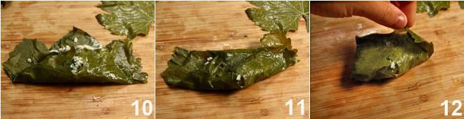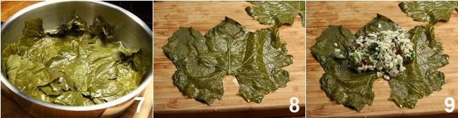 wash the vine leaves well and after blanching them in boiling water 7, let them drain well 8 by laying them on a clean cloth. Then let the mixture cool and when it is cold, place a teaspoon in each leaf, positioning it at the edge 9.