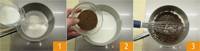 To prepare your warm coffee biscuit, start by putting the milk in a saucepan over medium heat 1. When it is hot, add the Nescafé and dissolve it well 2, stirring with a whisk 3.
