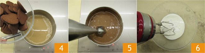 At this point, add the biscuits 4 and let them dissolve while continuing to stir. Once they are blended, use a hand blender to mix the mixture so there are no lumps 5. Set the biscuit mixture aside and prepare the cream: in a bowl, pour the cold cream and add the powdered sugar, whip with an electric whisk 6.