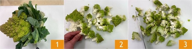 To prepare the warm rice salad with three broccolis, first clean and cut the broccolis: remove the base and leaves of the Romanesco broccoli 1, then separate the florets 2, dividing the larger ones into smaller pieces 3.