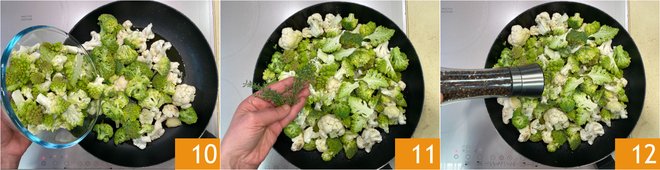 Also add the Romanesco broccoli 10, thyme sprigs 11, salt, and pepper 12.
