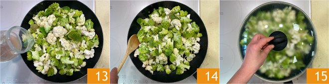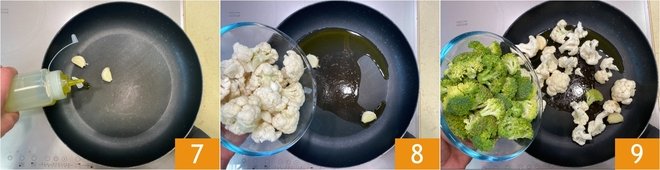 Pour a drizzle of oil into a large pan and flavor it with 2 cloves of garlic 7, then add the cauliflower 8 and the broccoli 9.