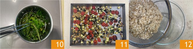 Let it go for 10 minutes on a very low flame. Remove the herbs 10 and let it cool. Remove the vegetables from the oven 11. Drain the rice and transfer it to a bowl 12.