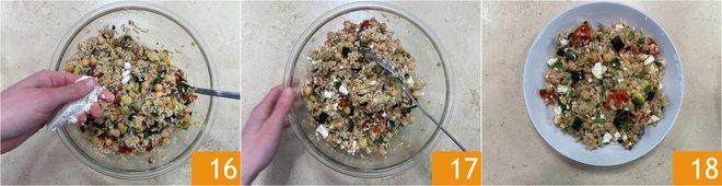 Crumble the feta 16 and mix to flavor 17, adjust with salt and pepper, add some fresh oregano leaves. Your warm rice with chickpeas, roasted vegetables, and feta is ready to be served 18.