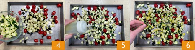 Add the eggplants and zucchinis as well 4, season with oil 5, salt, pepper, and fresh oregano 6, bake in a static oven at 450°F for 20 minutes.