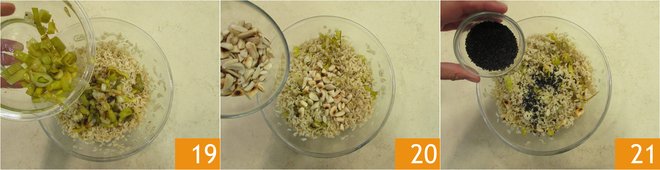Add the leek 19, chopped almonds 20, and black sesame seeds 21.