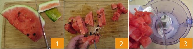 To make the watermelon popsicles, first cut the watermelon into slices, then remove the rind 1, cut it into pieces 2, and remove the seeds. Obtain 530 g (about 1 lb 2.7 oz) of pulp and pour it into the bowl of the blender 3.