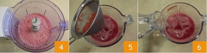 Blend the pulp until you get a smooth mixture 4. Strain it through a sieve 5 and incorporate the vodka 6.