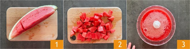 To prepare the watermelon sorbet with egg whites, take the watermelon 1, remove the rind, and cut 600 grams (about 21 oz) of pulp (if you want, you can remove all the seeds beforehand) into cubes 2. Use a blender to puree the pulp 3.