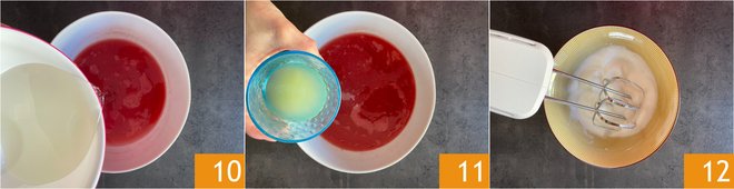 After the cooling time, add the sugar syrup 10 and lemon juice 11 to the watermelon pulp. Whip the egg whites until stiff peaks form 12.
