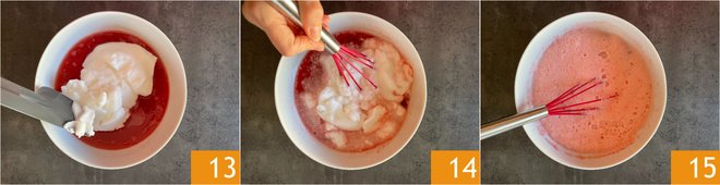 Add them to the watermelon mixture 13 and mix well using a whisk 14 until you get a homogeneous mixture 15.