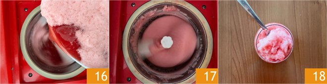 Pour the well-chilled mixture into the ice cream maker 16 and let it churn until you get a creamy sorbet 17, which will take about 20-30 minutes. Serve the watermelon sorbet with egg whites well chilled and enjoy immediately.