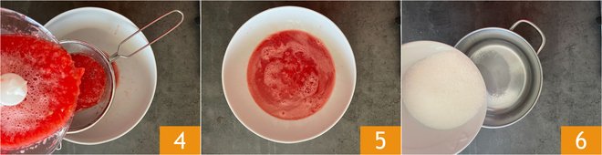 Strain it 4 to extract only the liquid part 5. Now prepare the sugar syrup: pour the water and sugar into a pot 6.