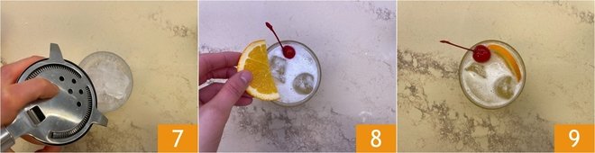 Strain the cocktail through the strainer 7 and fill the glasses to the brim, then garnish with an orange slice 8 and a maraschino cherry 9. Your whiskey sour is ready to be enjoyed!