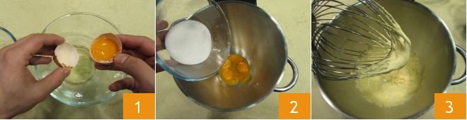 Set aside and also whip the egg whites with the other half of the sugar (4-5). At this point, combine the yolks with the egg whites 6, gently mixing from the bottom up so as not to deflate the mixture.