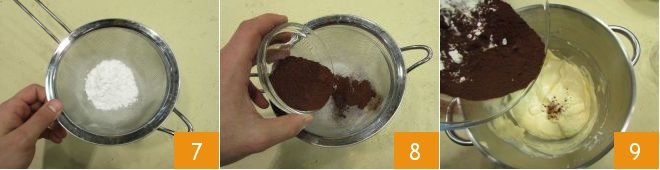 At this point, sift flour, potato starch 7, and cocoa powder 8 into a bowl. Add the dry ingredients to the egg mixture in two batches 9.