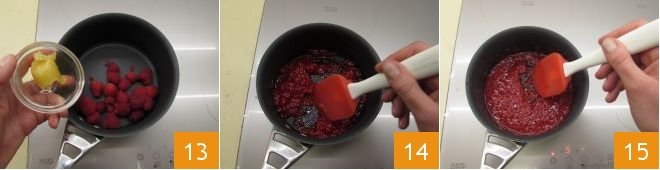 While the sponge cake is baking, start preparing the raspberry ganache. Pour raspberries and honey into a small saucepan 13. Cook over low heat for about 5 minutes, stirring often 14 until they soften and become a puree 15.