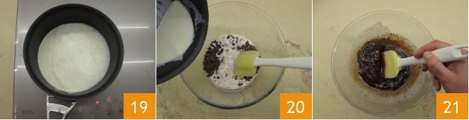 and bring the cream to a boil 19. Then, while keeping it warm, pour about half of the cream into the chocolate 20 and stir with a spatula to combine with the chocolate 21.