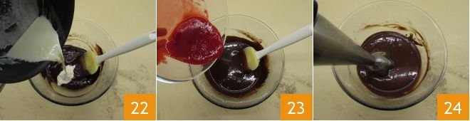 Pour the remaining cream 22 and stir again. Then add the raspberry mixture 23 and blend everything with an immersion blender 24.