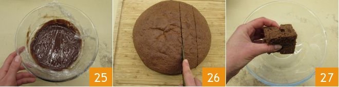 Cover with plastic wrap 25 and let crystallize in the refrigerator for 2 hours. After this time, remove the cooled sponge cake from the mold, take 150 grams of it, and cut it into pieces 26. Then crumble it with your hands into a bowl 27.