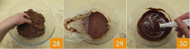 to obtain sponge cake crumbs 28. Take the chocolate ganache 29 and melt it in a double boiler or microwave, stirring often 30. Solidifying the ganache and then melting it again helps achieve a smoother finish on the final chocolate.
