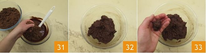 Pour the sponge cake into the ganache 31 and mix first with a spatula and, if necessary, with your hands to compact the mixture 32. Cover and let it firm up in the refrigerator for 30 minutes. Then take a portion of the mixture about 0.5 oz 33.