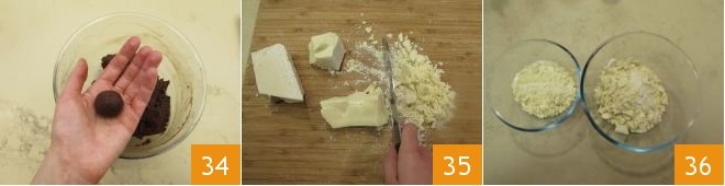 and with your hands, shape it into slightly elongated spheres, forming egg shapes 34. Continue this way until you have made them all (you will get about twenty), placing them on a tray lined with parchment paper, and place them in the refrigerator for another 30 minutes. Finely chop the white chocolate 35 and transfer 265 grams into one bowl and 135 grams into another 36. At this point, melt the larger batch of white chocolate in a double boiler or microwave, stirring often, and bring it to a temperature of 108°F.