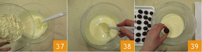 Then pour the other part of the chopped chocolate into the just-melted chocolate 37 and stir: the temperature should reach 84°F 38. Dip the balls one at a time into the melted white chocolate 39, gently submerging them,