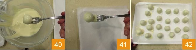 and use a fork to coat them entirely 40. Then transfer each bon bon onto a tray lined with parchment paper 41 and continue for all the others 42.