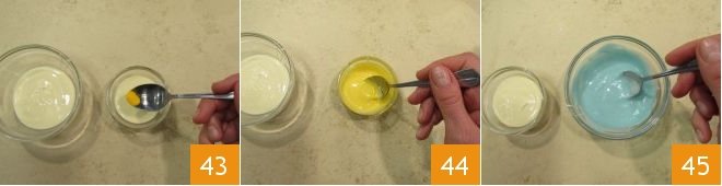 At this point, divide the remaining white chocolate into 4 or more small bowls: by adding different food colorings, you can decorate your bon bons. Add a pinch of fat-soluble coloring to each bowl 43 and mix 44 to create colored chocolate for decorations. We chose yellow, light blue 45.
