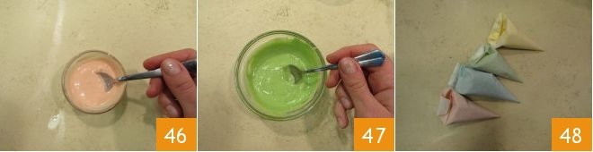 pink 46, and green 47. Prepare some How to make a piping cone with parchment paper and transfer the colored chocolate into each one 48.