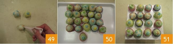 Use the cones to decorate your white chocolate bon bons as desired (49-50). Then store them in the refrigerator until ready to serve 51.