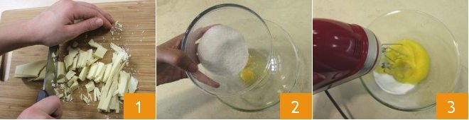To prepare the white chocolate brownies, first chop the white chocolate with a knife 1 and melt it in a double boiler or microwave. Melt the butter as well and let both cool. Now pour the room temperature eggs into a bowl, add the sugar 2, and beat with an electric mixer 3 until you get a fluffy and frothy mixture.