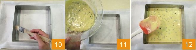 Line a baking sheet with parchment paper and place a square pastry ring of 8x8 inches on top, then butter 10 and flour it; alternatively, you can use a pan of the same size, buttered and floured. Pour the batter inside the mold 11, level it with a spatula 12, and bake in a preheated static oven at 350°F for about 22 minutes.