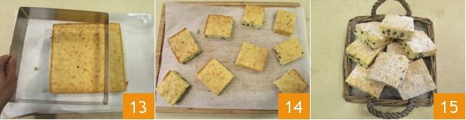 Once the baking time has elapsed, remove the square mold 13 and let your white chocolate brownies cool slightly before cutting them into squares 14 and serving them dusted with powdered sugar 15!