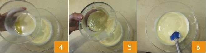 Combine the melted butter 4 and the melted white chocolate 5 into the mixture and mix with a spatula from the bottom up to blend everything well 6.