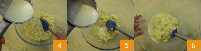 Pour about 1/3 of the hot cream over the white chocolate 4 and start stirring, keeping the cream warm on very low heat in the meantime. Then add half of the remaining cream (keeping the cream warm) and continue to stir 5. Add the rest of the cream and stir vigorously 6 until you get a smooth and homogeneous mixture. It will take some time and energy.