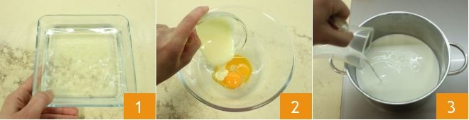 Preparation To make the chocolate pudding, place the gelatin sheets in a bowl with cold water for at least 10 minutes 1. Meanwhile, in a bowl, beat the egg yolks with the condensed milk 2, heat the milk in a saucepan over low heat 3