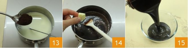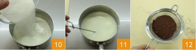 and also add the sugar 10, heat the mixture and stir to dissolve the sugar 11. Separately, sift the unsweetened cocoa powder 12