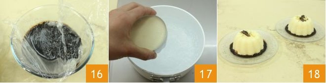 Then let it cool with a film in contact to prevent a skin from forming on the surface 16. When the pudding is well set, you can unmold it. To facilitate this operation, immerse the mold for a few moments in a pot with hot water 17 and then flip it onto the serving plate, on which you have poured a layer of chocolate sauce and then garnish the pudding with some dark chocolate curls 18.