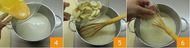then pour in the beaten egg mixture 4 and incorporate the white chocolate 5. Finally, add the drained and well-squeezed gelatin sheets 6 and stir until completely dissolved.