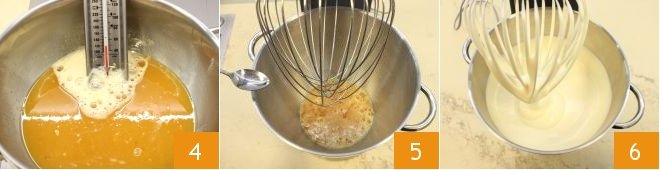 Heat the mixture to 113°F (45°C) using a food thermometer to monitor the temperature 4. Once the temperature is reached, transfer the mixture to a stand mixer fitted with a whisk attachment, add the bitter almond flavoring 5, and whip for 20 minutes at medium speed until you get a light and frothy batter 6.