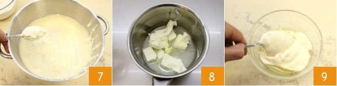 Gently fold in the sifted all-purpose flour and almond flour 7 so as not to deflate the mixture. Melt the butter over low heat 8, transfer it to a bowl, and temper it with two tablespoons of batter to help it incorporate more easily 9.