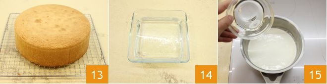 unmold it and let it cool completely on a wire rack 13. Now prepare the topping: soak the gelatin sheets in cold water for 10 minutes to soften them 14. Warm the cream in a saucepan with glucose syrup 15 until it is about to boil,