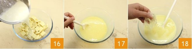 then turn off the heat and pour it into the bowl with the white chocolate 16, stirring until the chocolate is melted 17, then add the drained and well-squeezed gelatin sheets 18 and dissolve them in the mixture by stirring with a spoon.