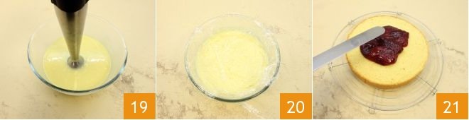 Blend the mixture with an immersion blender 19 and then strain it through a sieve to remove any air bubbles. Cover the cream with plastic wrap in contact 20 and let it cool, then put it in the refrigerator. Sift the jam to remove seeds, cut the cake into 3 parts; for this step, you can refer to the guide How to cut Sponge Cake. Spread each layer with jam using a spatula 21